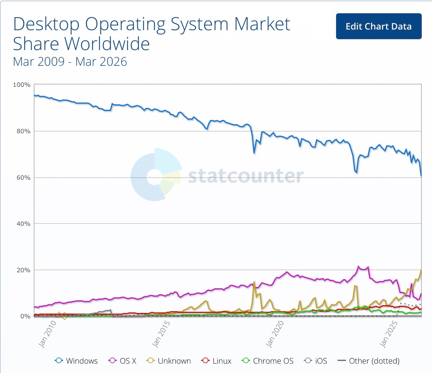 Yes, Windows install base has shrunk over the last 20 years. It is still the dominate platform at above 60%.